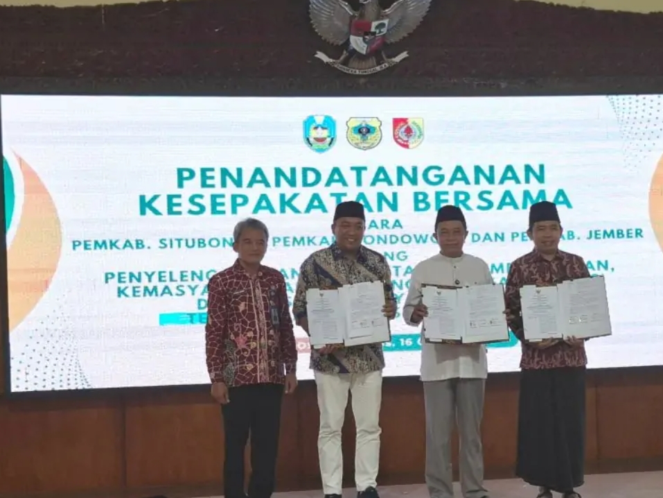 SITUBONDO – Bupati Situbondo, Bondowoso, dan Jember sepakat bekerja sama dalam bentuk aglomerasi untuk memperkuat ekonomi regional dan meningkatkan kesejahteraan masyarakat. Kesepakatan ini ditandai dengan penandatanganan perjanjian kerja sama lintas daerah bertempat di Pendopo Raden Bagus Asra, Bondowoso.
